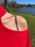 silver bra straps on a shoulder and red sweater